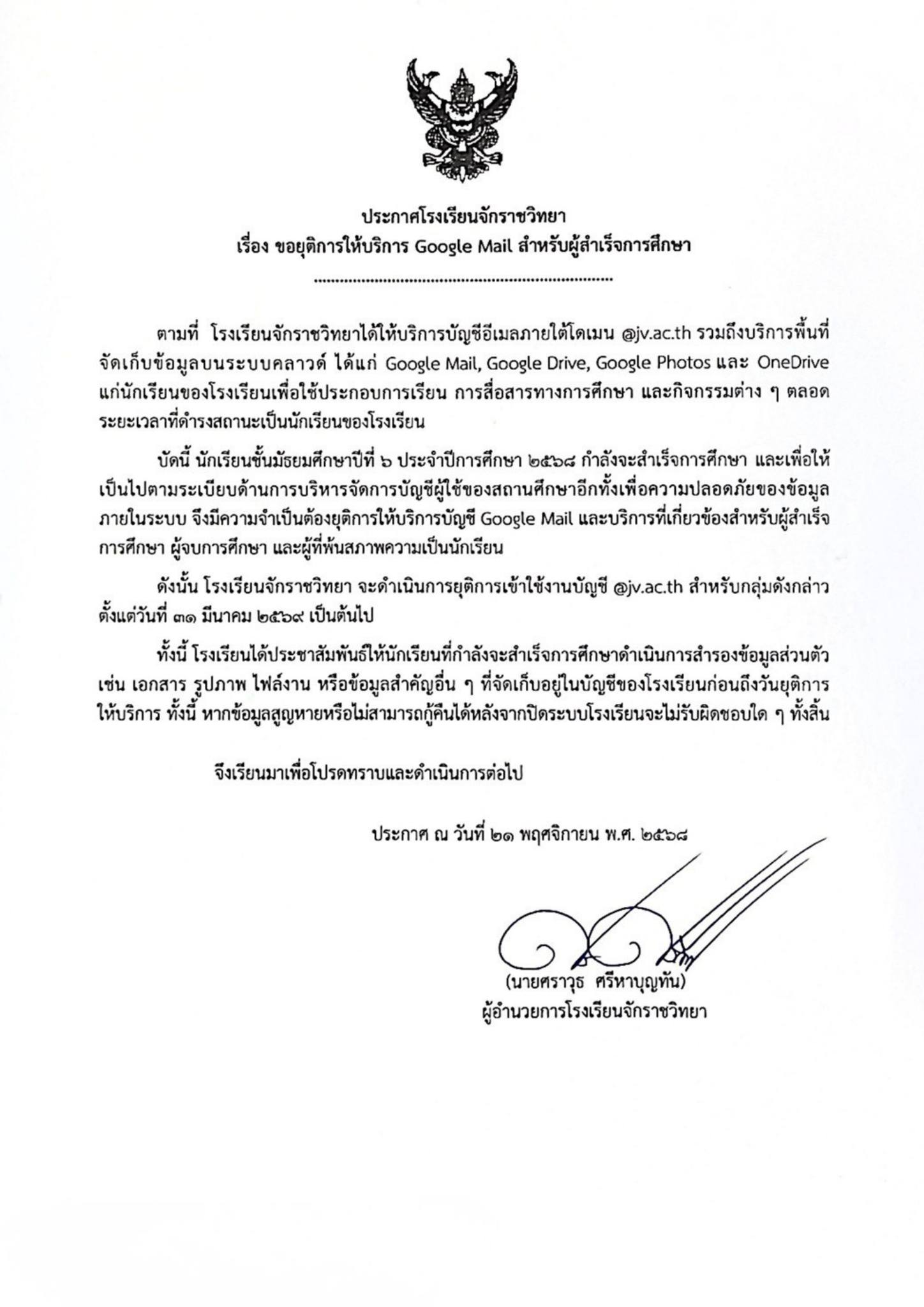 ภายใต้ชื่อบัญชี @jv.ac.th ให้แก่นักเรียนของโรงเรียนจักราชวิทยาตลอดระยะเวลาการเป็นนักเรียนนั้น