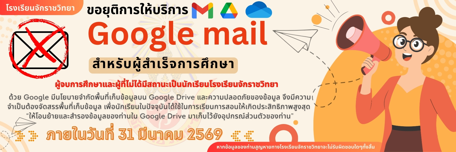 บัดนี้จะมีนักเรียนชั้นมัธยมศึกษาปีที่ 6 กำลังจะสำเร็จการศึกษา โรงเรียนจักราชวิทยาจึงจะ ยุติการให้บริการ Google Mail สำหรับผู้สำเร็จการศึกษา ผู้จบการศึกษา และผู้ที่ไม่มีสถานะเป็นนักเรียนปัจจุบัน