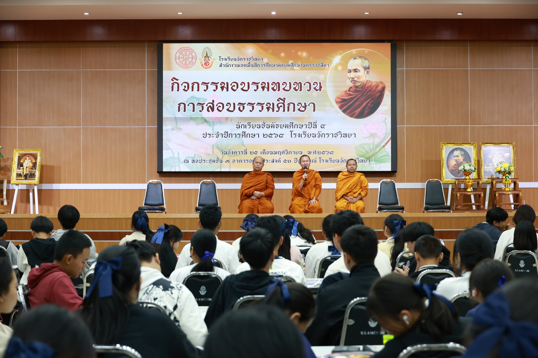 วันที่ 25 พฤศจิกายน พ.ศ. 2568 โรงเรียนจักราชวิทยา จัดกิจกรรมอบรมทบทวนการสอบธรรมศึกษา สำหรับนักเรียนระดับชั้นมัธยมศึกษาปีที่ 4 ประจำปีการศึกษา 2568 โดยได้รับเกียรติจาก ดร.ศราวุธ ศรีหาบุญทัน ผู้อำนวยการโรงเรียนจักราชวิทยา เป็นประธานในพิธีเปิด พร้อมด้วย รองผู้อำนวยการโรงเรียน คณะครู และนักเรียนเข้าร่วมอย่างพร้อมเพรียง กิจกรรมครั้งนี้ได้รับความเมตตาจาก พระครูพิจิตรธรรมปุคุณ รักษาการเจ้าคณะอำเภอพิมาย มาเป็นวิทยากรให้ความรู้ด้านธรรมศึกษา เพื่อเตรียมความพร้อมในการสอบธรรมสนามหลวง ตลอดจนปลูกฝังคุณธรรม จริยธรรม ค่านิยมที่พึงประสงค์ ส่งเสริมการแสวงหาความรู้ด้วยตนเอง และสามารถพัฒนาตนเองได้อย่างต่อเนื่อง ณ หอประชุมชั้น 3 อาคารอเนกประสงค์ 50 ปี อนุสรณ์ โรงเรียนจักราชวิทยา อำเภอจักราช จังหวัดนครราชสีมา