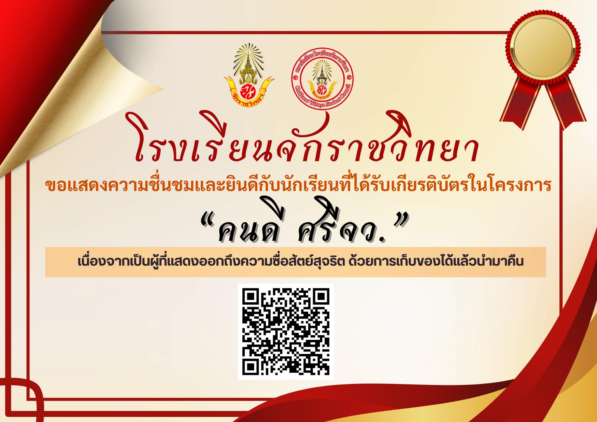 โรงเรียนจักราชวิทยา ขอแสดงความชื่นชมยินดีกับนักเรียนที่ได้รับเกียรติบัตรในโครงการ "คนดี ศรีจว."