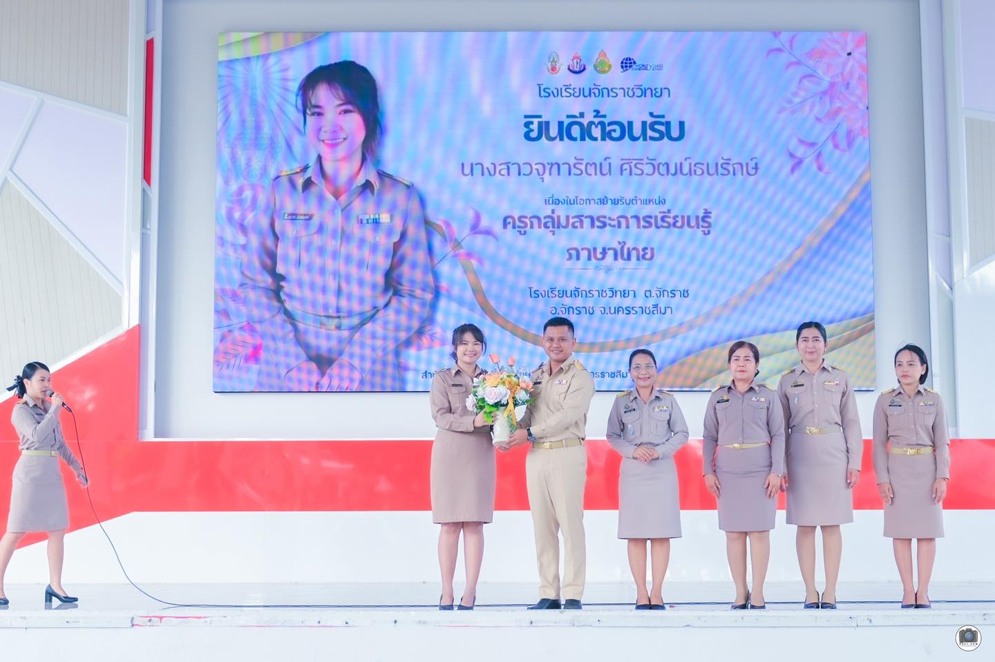 วันที่ 20 ตุลาคม พ.ศ. 2568 ดร.ศราวุธ ศรีหาบุญทัน ผู้อำนวยการโรงเรียนจักราชวิทยา พร้อมด้วย รองผู้อำนวยการโรงเรียน คณะครูและบุคลากรทางการศึกษา ร่วมให้การต้อนรับและมอบช่อดอกไม้แสดงความยินดีกับ นางสาวจุฑารัตน์ ศิริวัฒน์ธนรักษ์ เนื่องในโอกาสย้ายมาดำรงตำแหน่ง ครู กลุ่มสาระการเรียนรู้ภาษาไทย ทั้งนี้ โรงเรียนจักราชวิทยา ขอแสดงความยินดี และขอต้อนรับสู่ครอบครัวจักราชวิทยาด้วยความยินดียิ่ง ณ ห้อง Smart Convention โรงเรียนจักราชวิทยา อำเภอจักราช จังหวัดนครราชสีมา