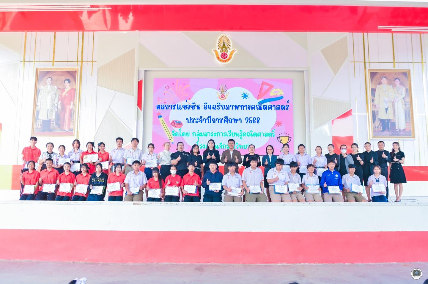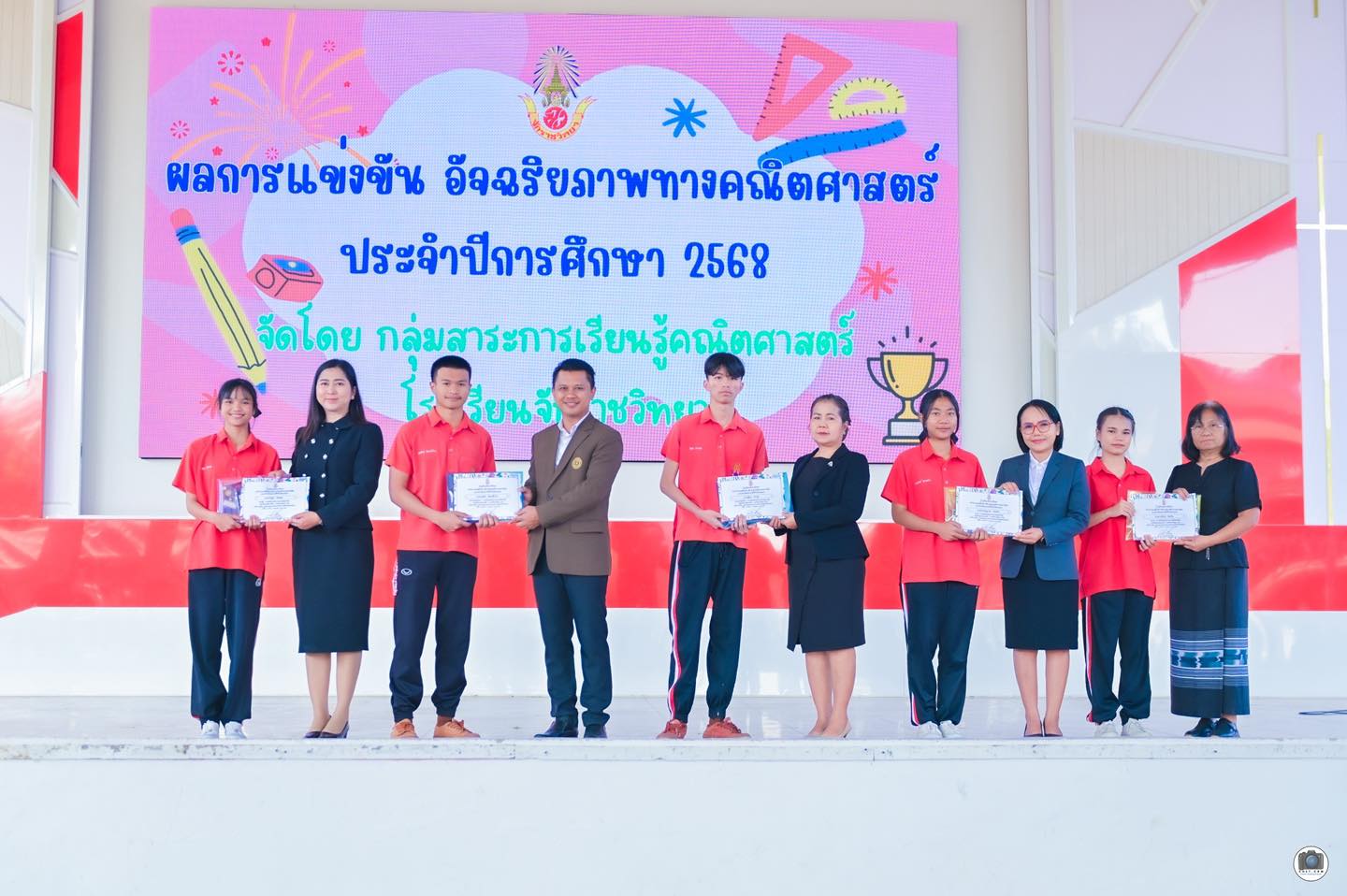 วันที่ 10 กุมภาพันธ์ พ.ศ. 2569 โรงเรียนจักราชวิทยา นำโดย ดร.ศราวุธ ศรีหาบุญทัน ผู้อำนวยการโรงเรียนจักราชวิทยา พร้อมด้วยรองผู้อำนวยการโรงเรียน ได้ร่วมมอบเกียรติบัตรและแสดงความยินดีแก่นักเรียนที่ได้รับรางวัลจากการสอบแข่งขันอัจฉริยภาพทางคณิตศาสตร์ ประจำปีการศึกษา 2568 ในโอกาสนี้ ผู้อำนวยการโรงเรียนได้กล่าวชื่นชมในความสามารถ ความมุ่งมั่น และความพยายามของนักเรียน พร้อมทั้งมอบโอวาทเพื่อเป็นขวัญและกำลังใจแก่นักเรียนและคณะครูผู้ฝึกสอน โดยมีคณะครูและนักเรียนร่วมแสดงความยินดีอย่างพร้อมเพรียง ณ โดม 42 ปี อนุสรณ์ โรงเรียนจักราชวิทยา อำเภอจักราช จังหวัดนครราชสีมา