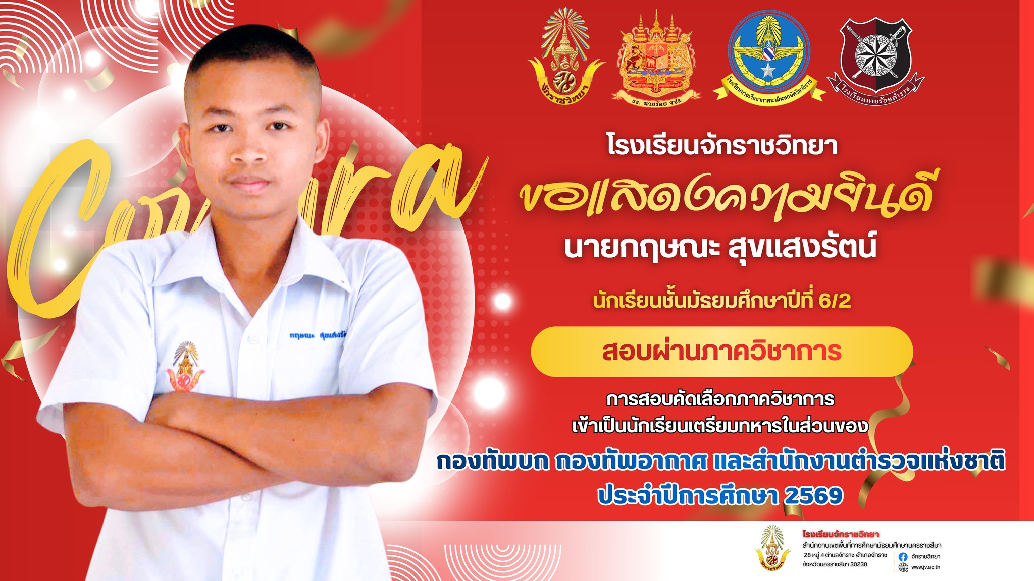 โรงเรียนจักราชวิทยา ขอแสดงความชื่นชมและยินดีกับ นายกฤษณะ สุขแสงรัตน์ นักเรียนชั้นมัธยมศึกษาปีที่ 6/2 ในโอกาส "สอบผ่านภาควิชาการ" การสอบคัดเลือกเข้าเป็นนักเรียนเตรียมทหาร ประจำปีการศึกษา 2569 ถึง 3 เหล่าทัพ ได้แก่: