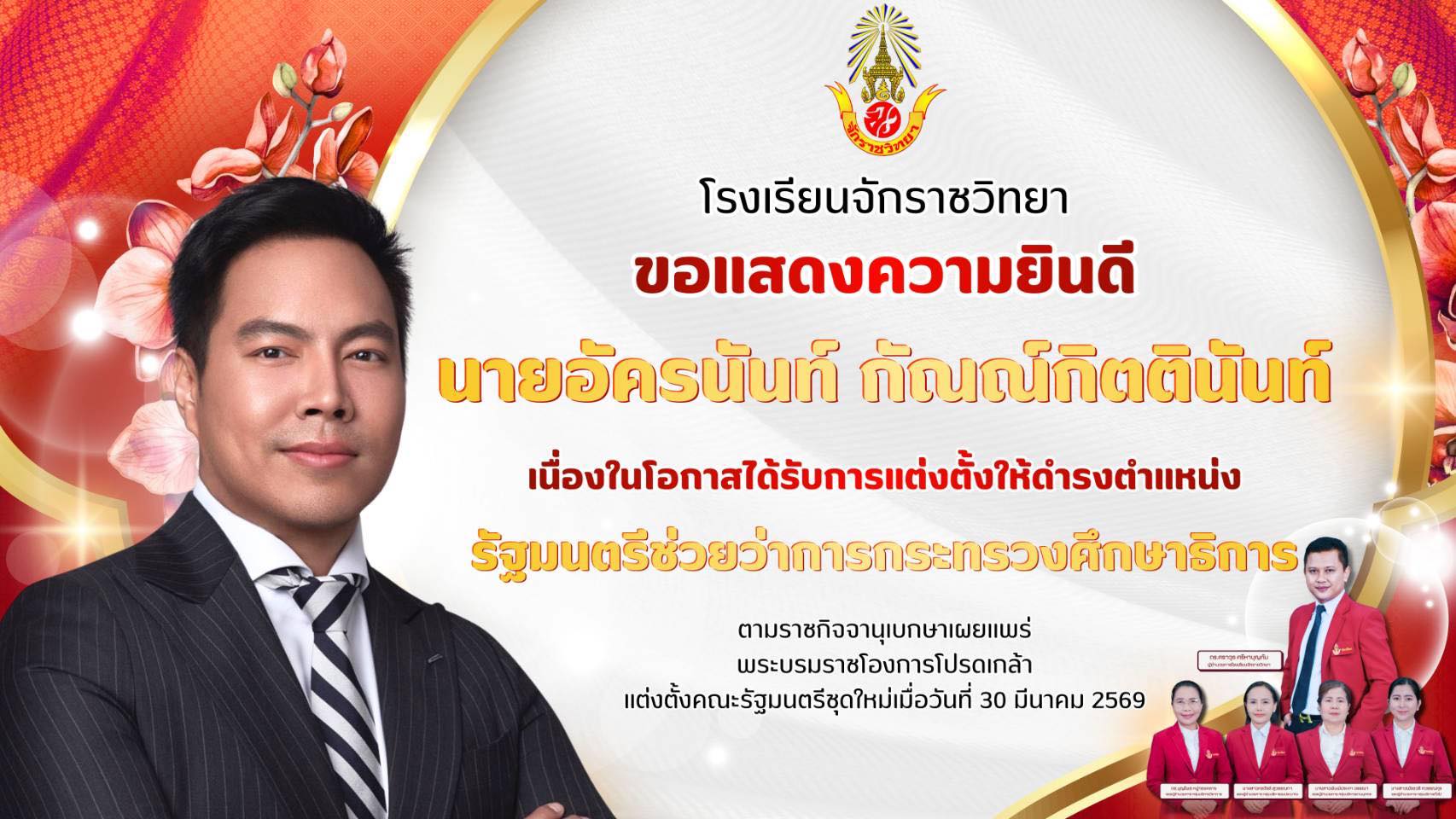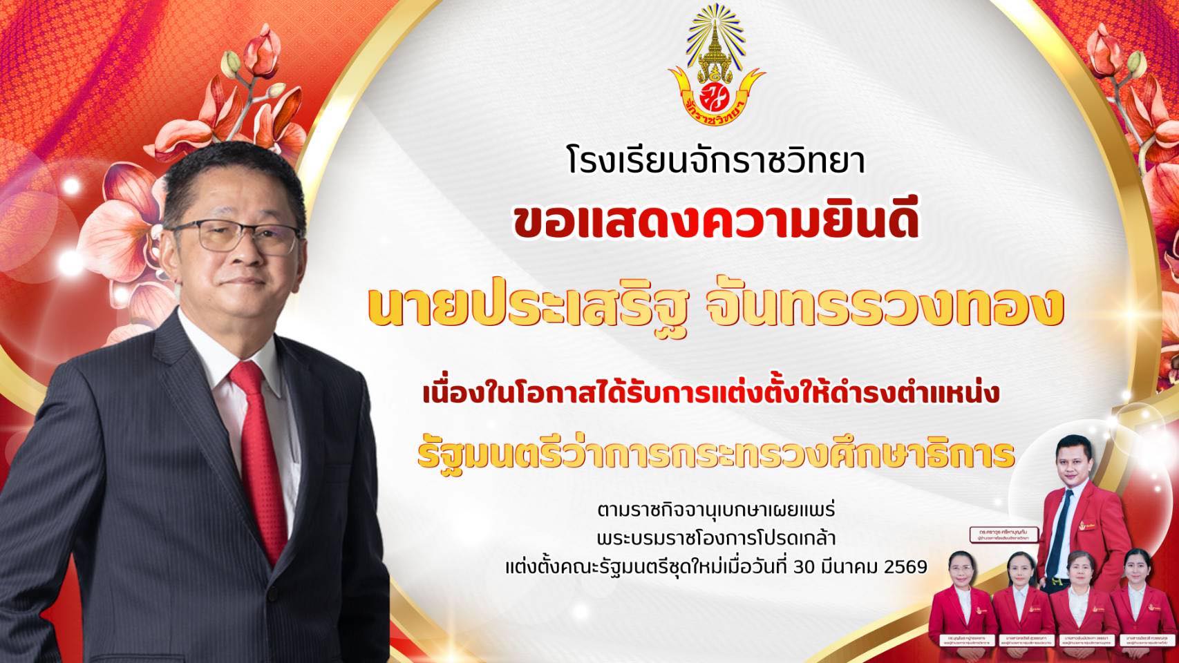 คณะผู้บริหาร คณะครู บุคลากรทางการศึกษา และนักเรียนโรงเรียนจักราชวิทยา ขอแสดงความยินดีอย่างยิ่งแก่รัฐมนตรีทั้งสองท่าน เนื่องในโอกาสที่มีพระบรมราชโองการโปรดเกล้าโปรดกระหม่อมแต่งตั้งให้ดำรงตำแหน่ง