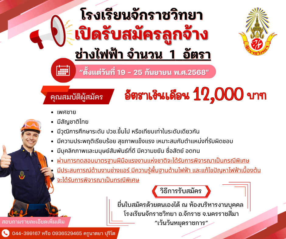 รายละเอียดเพิ่มเติม : ประกาศโรงเรียนจักราชวิทยา เรื่อง ประกาศรับสมัครบุคคลทั่วไปเพื่อคัดเลือกเป็นลูกจ้างปฏิบัติงานให้ราชการ (จ้างเหมาบริการ) ตำแหน่ง ช่างไฟฟ้า