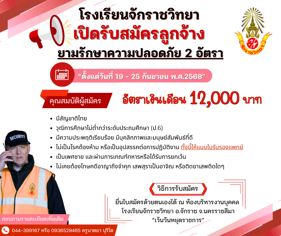 ประกาศโรงเรียนจักราชวิทยา เรื่อง รับสมัครบุคคลเพื่อเลือกสรรเป็นลูกจ้างปฏิบัติงานให้ราชการ (จ้างเหมาบริการ) ตำแหน่ง ยามรักษาความปลอดภัย โรงเรียนจักราชวิทยา