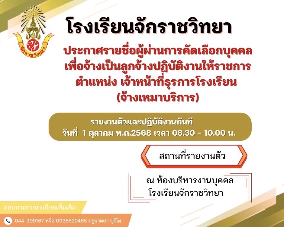 ข่าวประชาสัมพันธ์ ประกาศโรงเรียนจักราชวิทยา เรื่อง รายชื่อผู้ผ่านการคัดเลือกบุคคลเพื่อจ้างเป็นลูกจ้างปฏิบัติงานให้ราชการ ตำแหน่ง เจ้าหน้าที่ธุรการโรงเรียน (จ้างเหมาบริการ) รายชื่อผู้ผ่านการคัดเลือกบุคคลเพื่อจ้างเป็นลูกจ้างปฏิบัติงานให้ราชการ ตำแหน่ง เจ้าหน้าที่ธุรการโรงเรียน (จ้างเหมาบริการ) 72 Views 30 September 2025