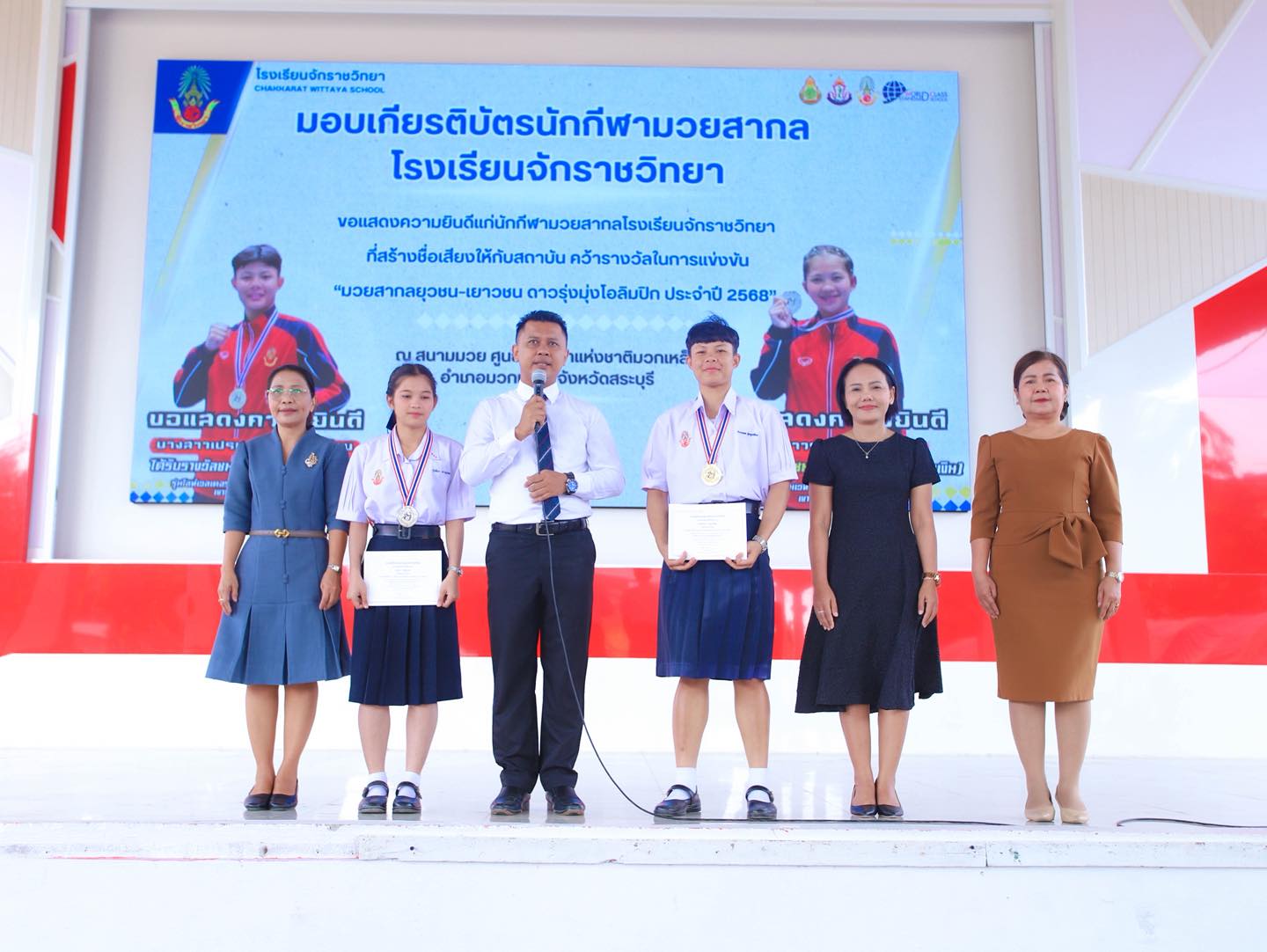 วันที่ 21 ตุลาคม พ.ศ. 2568 ดร.ศราวุธ ศรีหาบุญทัน ผู้อำนวยการโรงเรียนจักราชวิทยา พร้อมด้วย รองผู้อำนวยการโรงเรียน ร่วมมอบเกียรติบัตรให้แก่นักเรียน เนื่องในโอกาสได้รับรางวัลจากการแข่งขันมวยสากลยุวชน - เยาวชน ดาวรุ่งมุ่งโอลิมปิก ประจำปี 2568 จำนวน 2 รางวัล ได้แก่ นางสาวเปรมกมล สุขงูเหลือม นักเรียนชั้นมัธยมศึกษาปีที่ 5/5