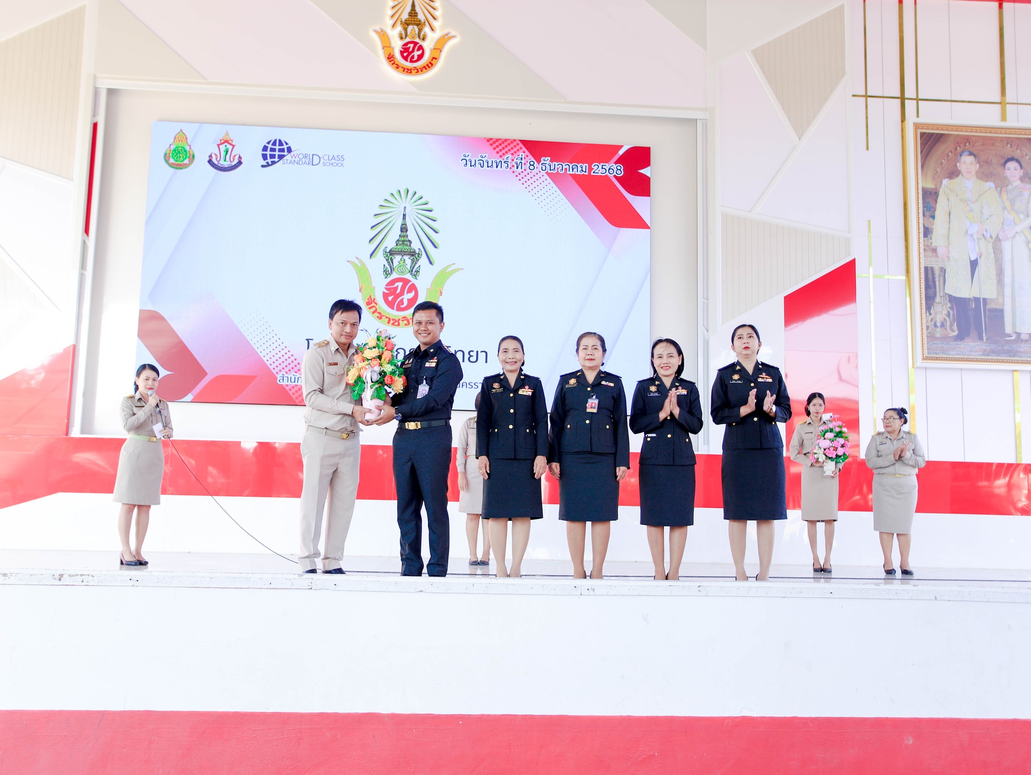 วันที่ 8 ธันวาคม พ.ศ. 2568 ดร.ศราวุธ ศรีหาบุญทัน ผู้อำนวยการโรงเรียนจักราชวิทยา พร้อมด้วย รองผู้อำนวยการโรงเรียน คณะครู บุคลากรทางการศึกษา และนักเรียนโรงเรียนจักราชวิทยา ร่วมให้การต้อนรับและมอบช่อดอกไม้แสดงความยินดีกับ นางสาวปัญฑิตา เชาว์มะเริง เนื่องในโอกาสได้รับการบรรจุแต่งตั้งให้ดำรงตำแหน่ง ครูผู้ช่วย เอกภาษาอังกฤษ กลุ่มสาระการเรียนรู้ภาษาต่างประเทศ พร้อมกันนี้ ได้ร่วมแสดงความยินดีกับ นายธัญพิสิษฐ์ อ่อนศรี ครู กลุ่มสาระการเรียนรู้วิทยาศาสตร์และเทคโนโลยี เนื่องในโอกาสย้ายไปดำรงตำแหน่ง ครู ณ โรงเรียนสุรนารีวิทยา อำเภอเมือง จังหวัดนครราชสีมา ในโอกาสนี้ โรงเรียนจักราชวิทยาขอแสดงความยินดีอย่างยิ่งต่อทั้งสองท่าน พร้อมขอให้ประสบความสำเร็จในเส้นทางวิชาชีพ และปฏิบัติหน้าที่ราชการด้วยความเจริญก้าวหน้าและมั่นคงสืบไป ณ โดม 42 ปี อนุสรณ์ โรงเรียนจักราชวิทยา อำเภอจักราช จังหวัดนครราชสีมา