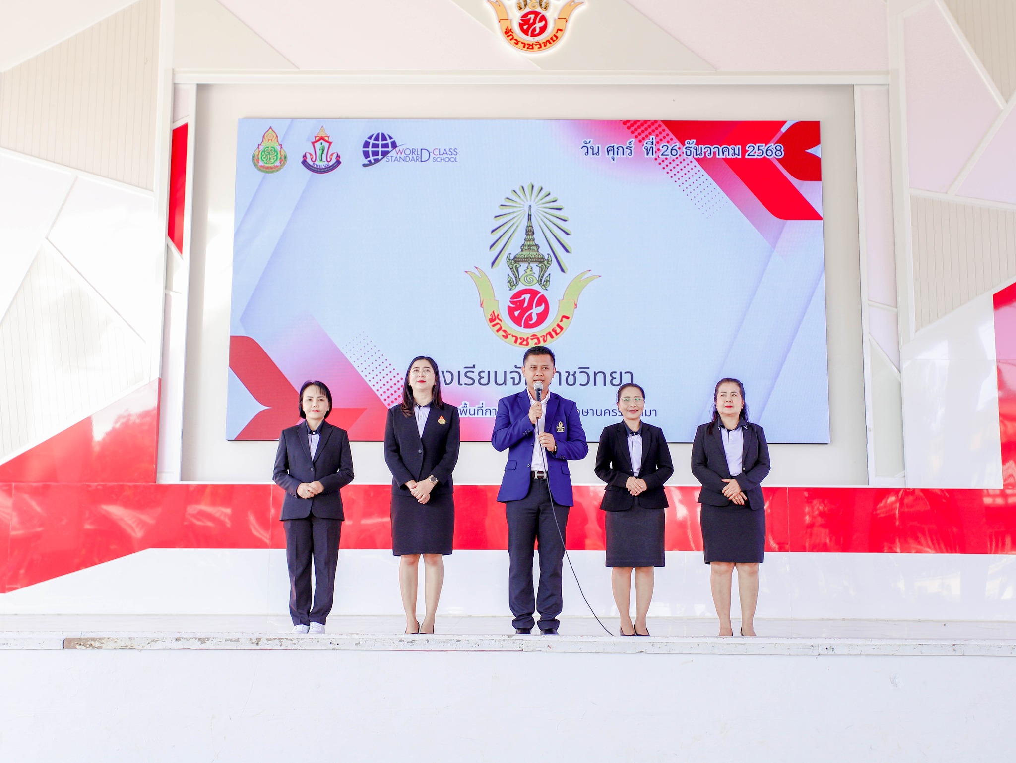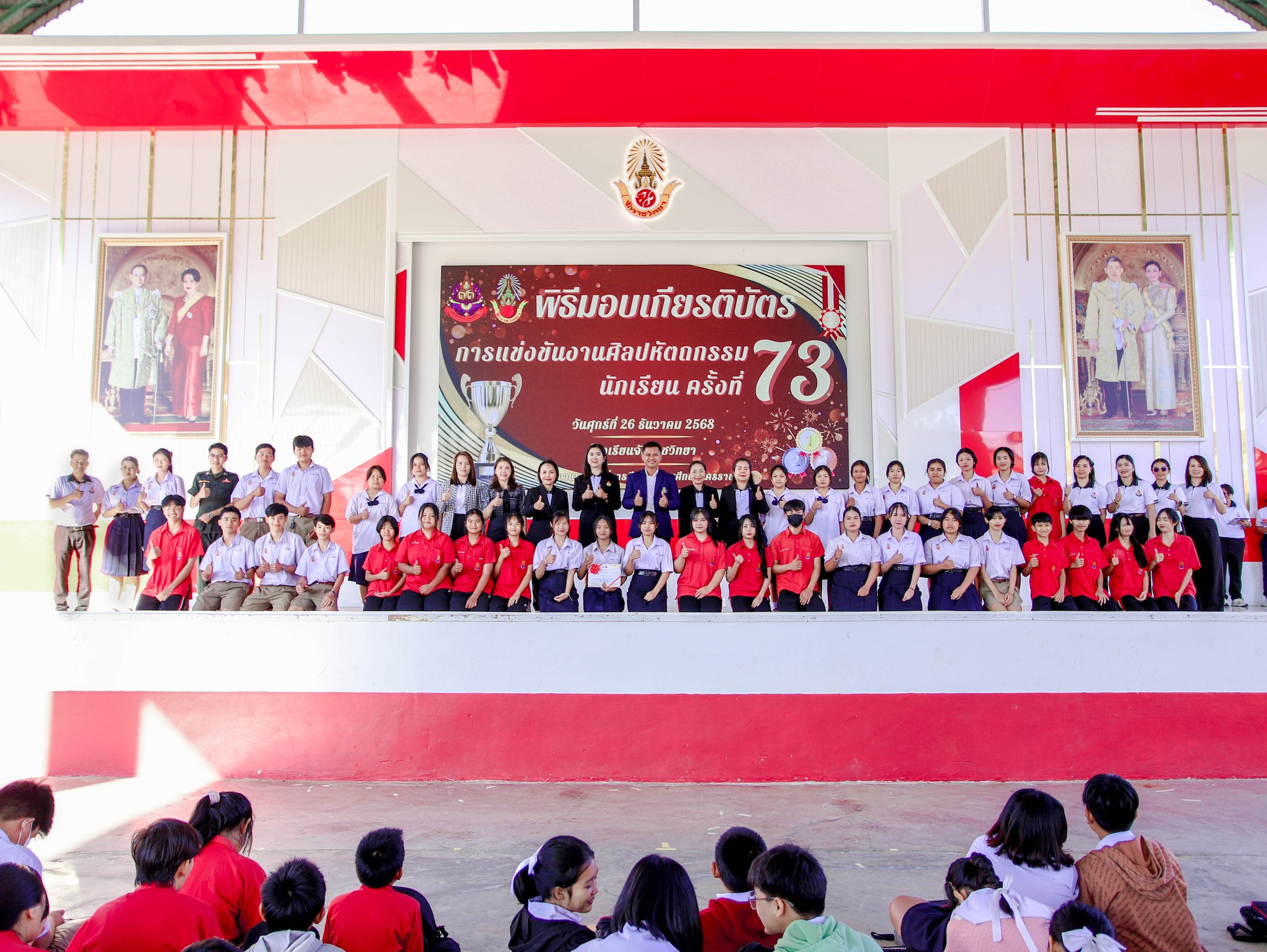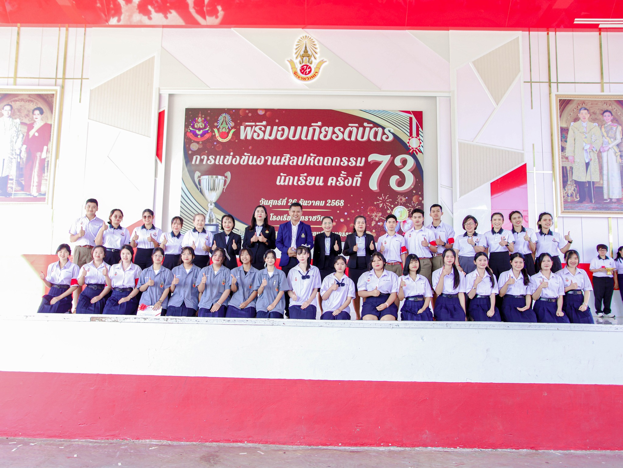 วันที่ 26 ธันวาคม พ.ศ. 2568 ดร.ศราวุธ ศรีหาบุญทัน ผู้อำนวยการโรงเรียนจักราชวิทยา พร้อมด้วย รองผู้อำนวยการโรงเรียน ได้ร่วมมอบเกียรติบัตรแก่ครูผู้ฝึกสอนและนักเรียนที่เข้าร่วมการแข่งขันศิลปหัตถกรรมนักเรียนมัธยมศึกษาจังหวัดนครราชสีมา ครั้งที่ 73 ประจำปีการศึกษา 2568 ซึ่งจัดโดยสำนักงานเขตพื้นที่การศึกษามัธยมศึกษานครราชสีมา และดำเนินการแข่งขันระหว่างวันที่ 10-12 ธันวาคม พ.ศ. 2568 ในโอกาสนี้ ผู้อำนวยการโรงเรียนได้กล่าวแสดงความยินดีและมอบโอวาท เพื่อเป็นขวัญและกำลังใจแก่คณะครูผู้ฝึกสอนและนักเรียน ณ โดม 42 ปี อนุสรณ์ โรงเรียนจักราชวิทยา อำเภอจักราช จังหวัดนครราชสีมา