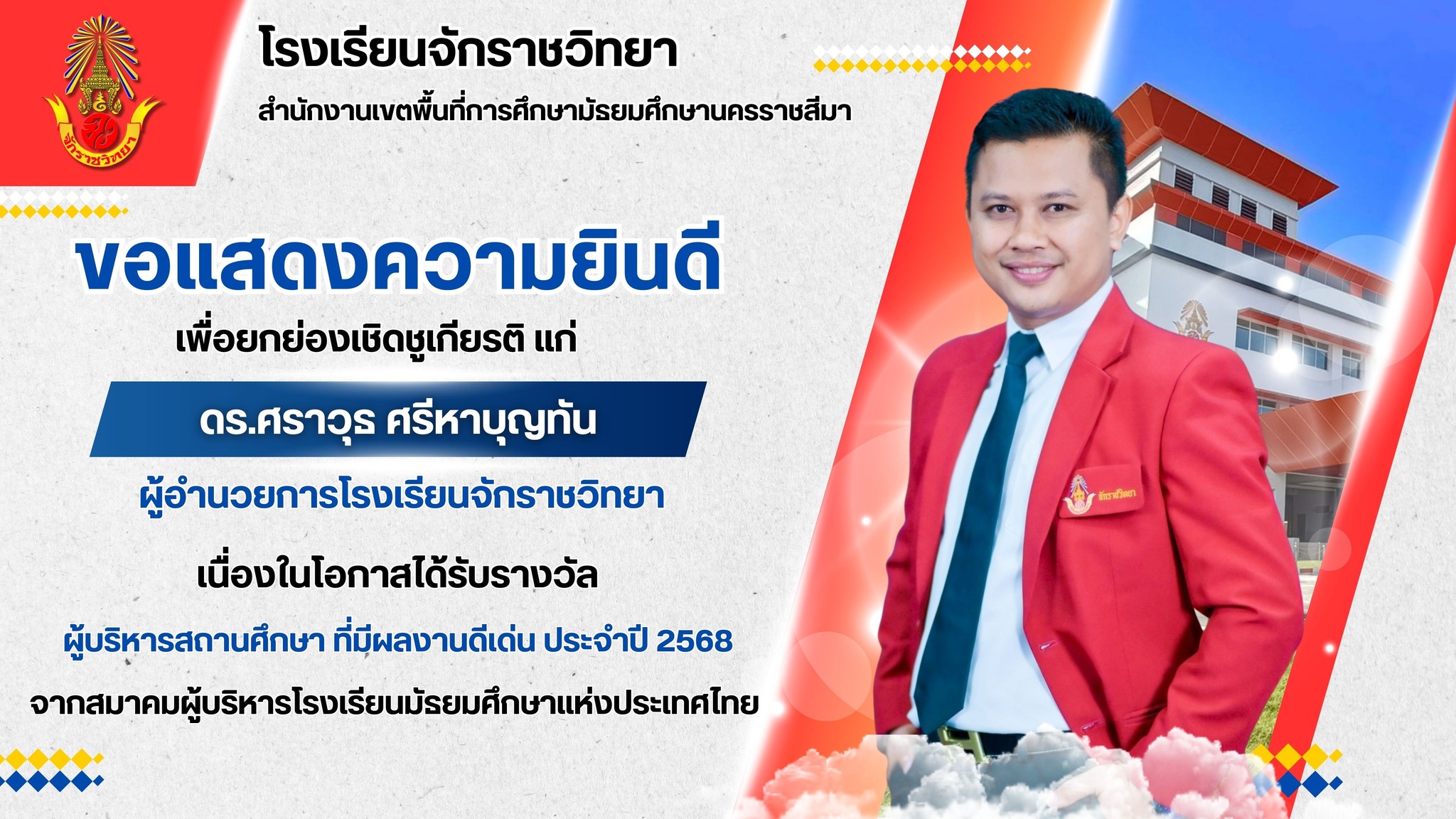 ขอแสดงความยินดีกับ นายศราวุธ ศรีหาบุญทัน ผู้อำนวยการโรงเรียนจักราชวิทยา ได้รับรางวัลผู้บริหารสถานศึกษาดีเด่น
