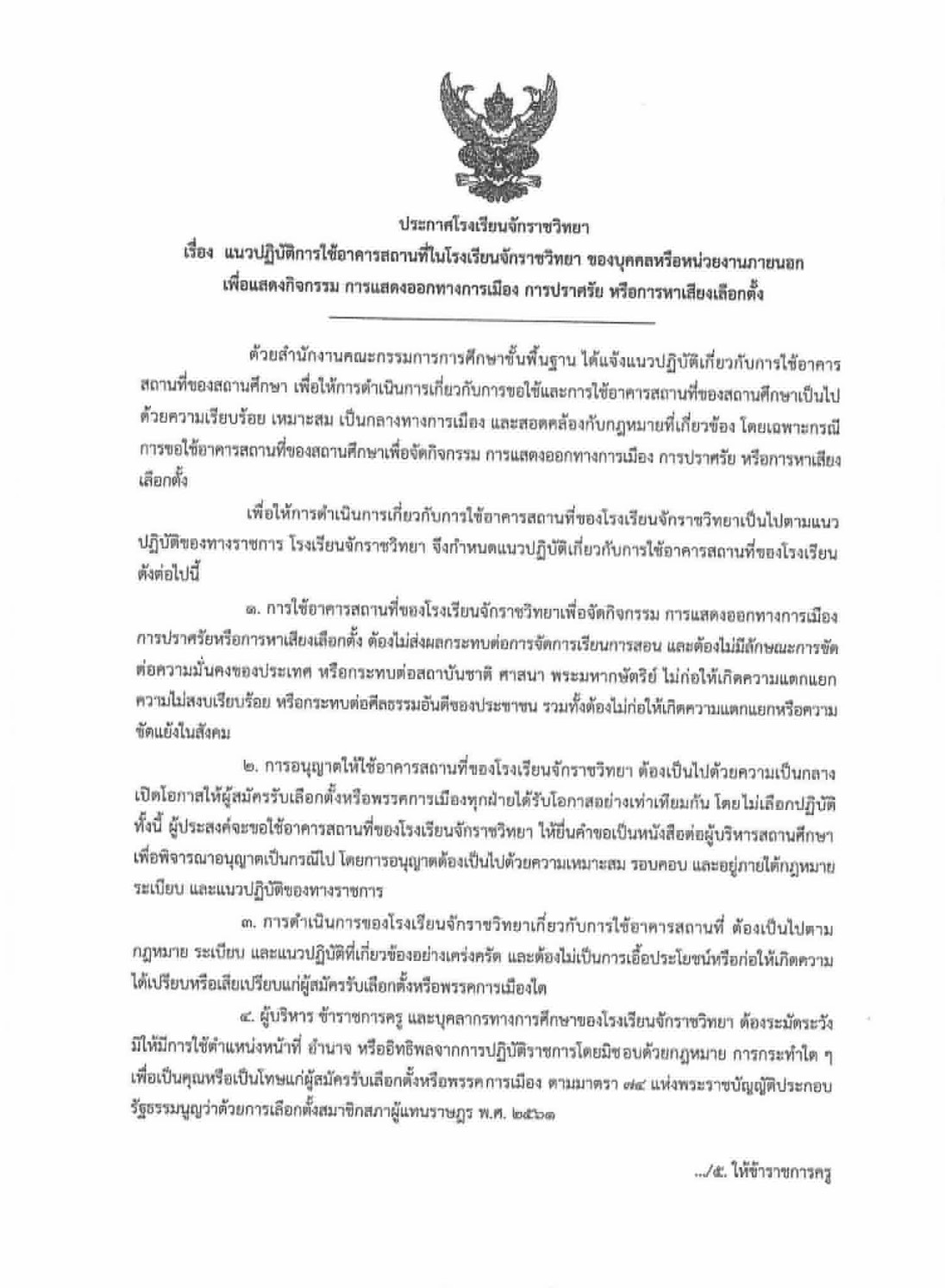 โรงเรียนจักราชวิทยา ขอแจ้งแนวปฏิบัติเกี่ยวกับการใช้อาคารสถานที่ของโรงเรียน เพื่อกิจกรรมทางการเมืองและการปราศรัย หรือการหาเสียงเลือกตั้ง