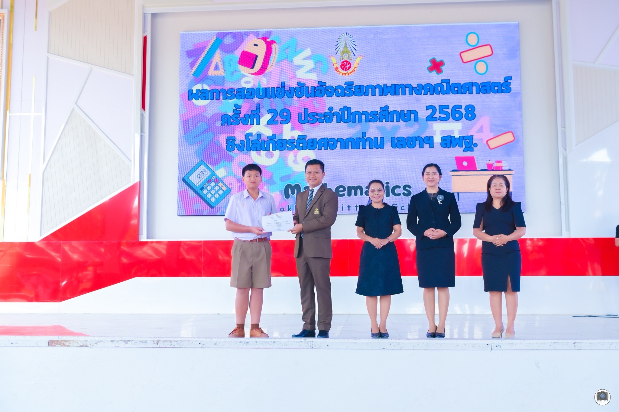 วันที่ 3 กุมภาพันธ์ พ.ศ. 2569 โรงเรียนจักราชวิทยา นำโดย ดร.ศราวุธ ศรีหาบุญทัน ผู้อำนวยการโรงเรียนจักราชวิทยา พร้อมด้วย รองผู้อำนวยการโรงเรียน ร่วมมอบรางวัลและแสดงความยินดีแก่นักเรียนที่เข้าร่วมการสอบแข่งขันอัจฉริยภาพทางคณิตศาสตร์ ครั้งที่ 29 ประจำปีการศึกษา 2568 เนื่องในโอกาสชิงโล่เกียรติยศโดย เลขาธิการคณะกรรมการการศึกษาขั้นพื้นฐาน (สพฐ.) ในการนี้ ดร.ศราวุธ ศรีหาบุญทัน ผู้อำนวยการโรงเรียนจักราชวิทยา ได้กล่าวแสดงความชื่นชมในความสามารถ ความมุ่งมั่น และความพยายามของนักเรียน พร้อมทั้งมอบโอวาทเพื่อเป็นขวัญและกำลังใจแก่นักเรียนและคณะครูผู้ฝึกสอน โดยมีคณะครูและนักเรียนร่วมแสดงความยินดีอย่างพร้อมเพรียง ณ โดม 42 ปี อนุสรณ์ โรงเรียนจักราชวิทยา อำเภอจักราช จังหวัดนครราชสีมา