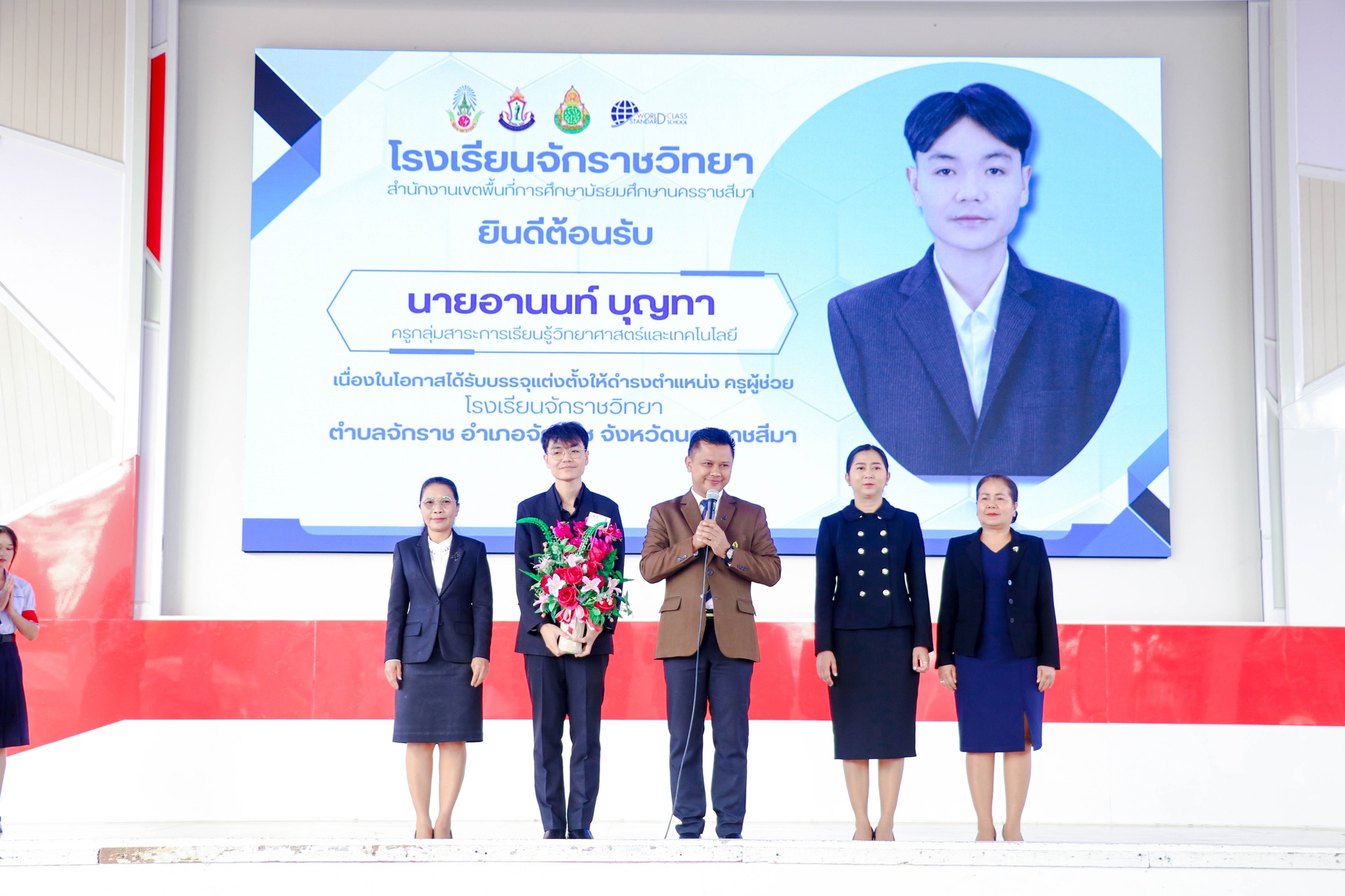 วันที่ 27 มกราคม พ.ศ. 2569 ดร.ศราวุธ ศรีหาบุญทัน ผู้อำนวยการโรงเรียน พร้อมด้วย รองผู้อำนวยการโรงเรียน คณะครู บุคลากรทางการศึกษา และนักเรียน ร่วมให้การต้อนรับและมอบช่อดอกไม้แสดงความยินดีกับ นายอานนท์ บุญทา เนื่องในโอกาสได้รับบรรจุและแต่งตั้งให้ดำรงตำแหน่ง ครูผู้ช่วย เอกชีววิทยา กลุ่มสาระการเรียนรู้วิทยาศาสตร์และเทคโนโลยี ในการนี้ โรงเรียนจักราชวิทยา ขอแสดงความยินดีและขอต้อนรับสู่ครอบครัวจักราชวิทยาด้วยความยินดียิ่ง ณ โดม 42 ปี อนุสรณ์ โรงเรียนจักราชวิทยา อำเภอจักราช จังหวัดนครราชสีมา