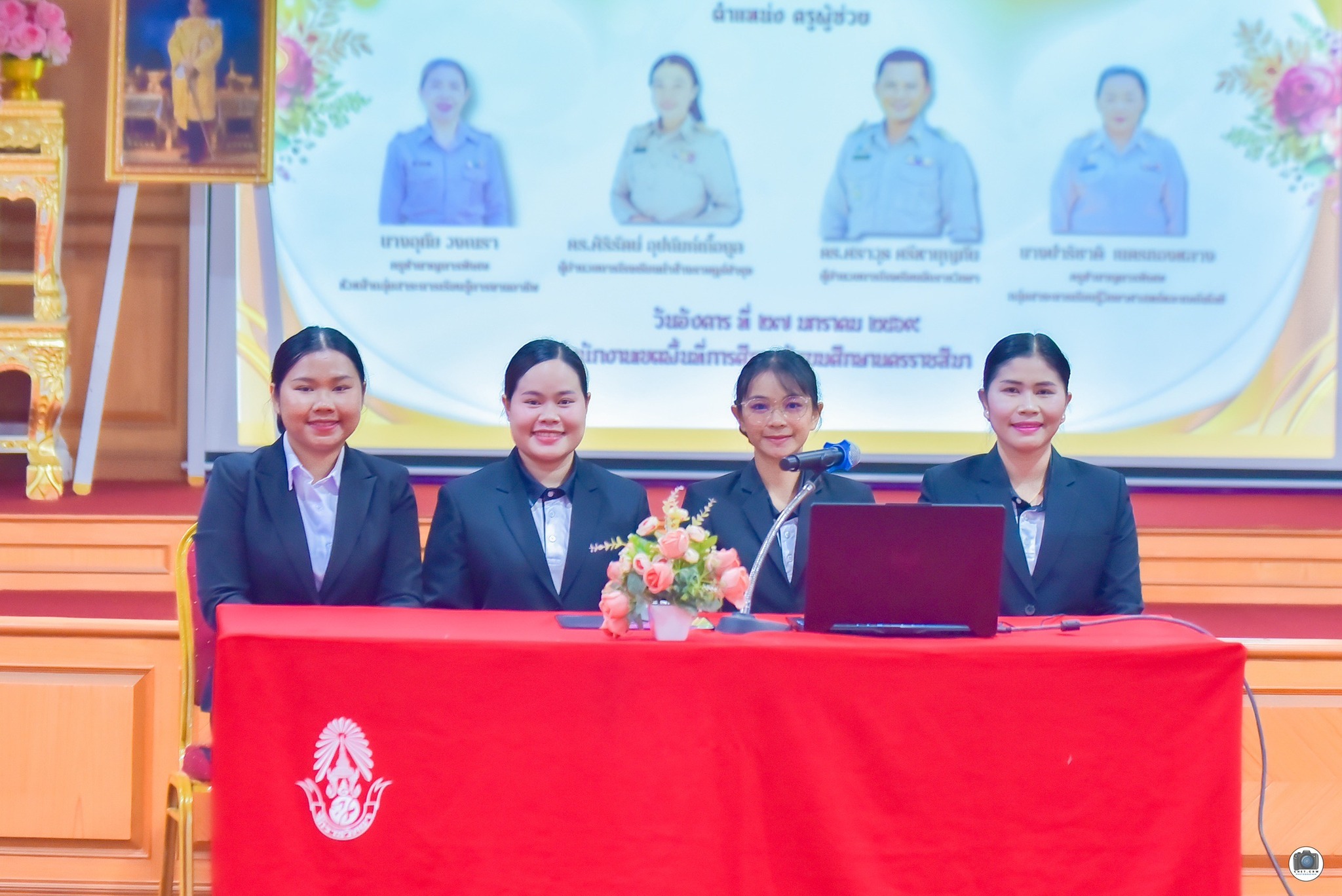 นางณัชชา ศรีแสนปาง ผู้อำนวยการโรงเรียนจักราชวิทยา มอบช่อดอกไม้แสดงความยินดี และกล่าวต้อนรับ นางสาววาสนา พิระชัย วิชาเอกคณิตศาสตร์ จากโรงเรียนโนนสูงศรีธานี