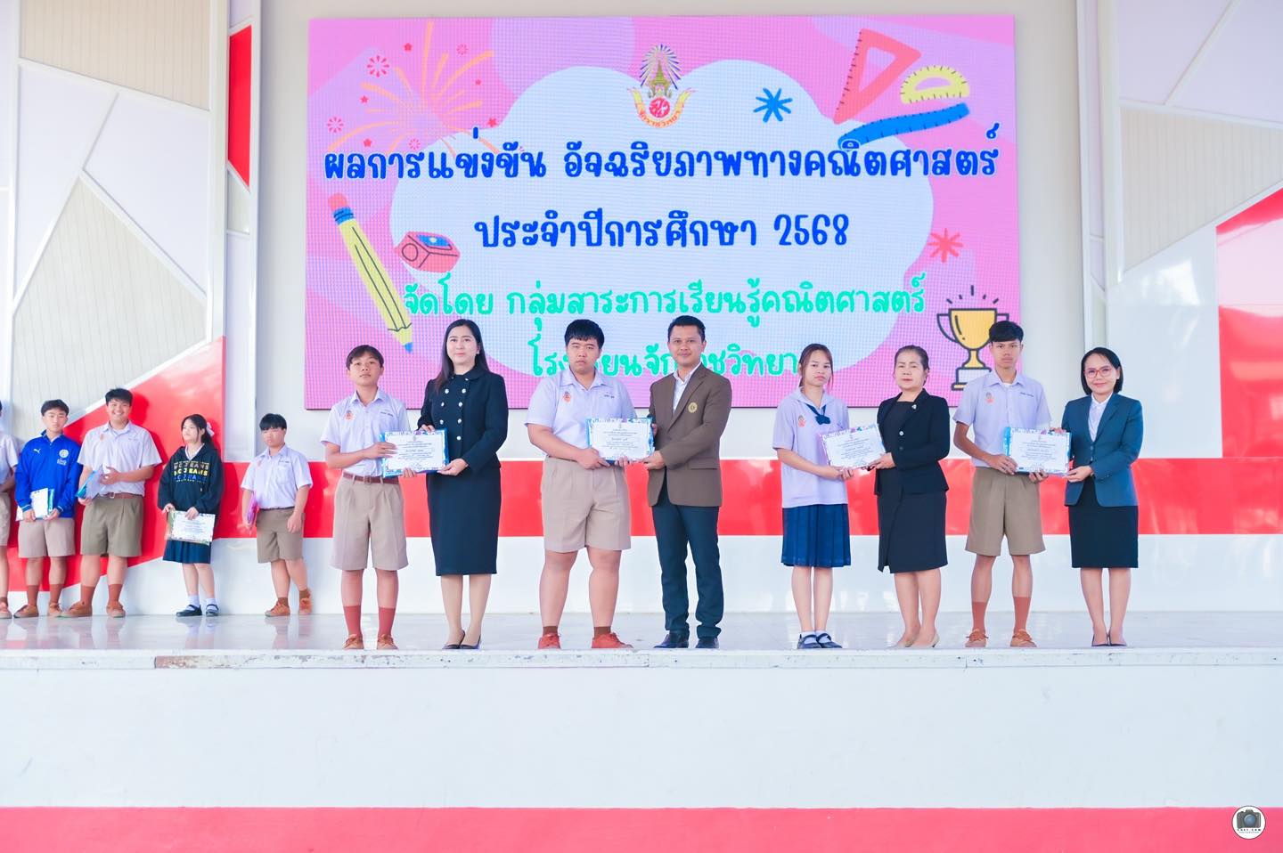 วันที่ 10 กุมภาพันธ์ พ.ศ. 2569 โรงเรียนจักราชวิทยา นำโดย ดร.ศราวุธ ศรีหาบุญทัน ผู้อำนวยการโรงเรียนจักราชวิทยา พร้อมด้วยรองผู้อำนวยการโรงเรียน ได้ร่วมมอบเกียรติบัตรและแสดงความยินดีแก่นักเรียนที่ได้รับรางวัลจากการสอบแข่งขันอัจฉริยภาพทางคณิตศาสตร์ ประจำปีการศึกษา 2568 ในโอกาสนี้ ผู้อำนวยการโรงเรียนได้กล่าวชื่นชมในความสามารถ ความมุ่งมั่น และความพยายามของนักเรียน พร้อมทั้งมอบโอวาทเพื่อเป็นขวัญและกำลังใจแก่นักเรียนและคณะครูผู้ฝึกสอน โดยมีคณะครูและนักเรียนร่วมแสดงความยินดีอย่างพร้อมเพรียง ณ โดม 42 ปี อนุสรณ์ โรงเรียนจักราชวิทยา อำเภอจักราช จังหวัดนครราชสีมา