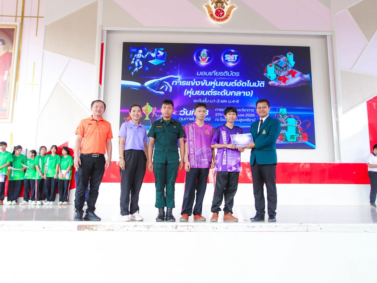 วันที่ 18 กุมภาพันธ์ พ.ศ. 2569 โรงเรียนจักราชวิทยา นำโดย ดร.ศราวุธ ศรีหาบุญทัน ผู้อำนวยการโรงเรียนจักราชวิทยา ได้มอบเกียรติบัตรและแสดงความยินดีแก่นักเรียนที่ได้รับรางวัลจากการแข่งขันหุ่นยนต์อัตโนมัติ (หุ่นยนต์ระดับกลาง) ในการแข่งขันทักษะวิชาการ STN Open House 2026 ณ โรงเรียนโนนสูงศรีธานี ในการนี้ ผู้อำนวยการโรงเรียนได้กล่าวชื่นชมในความสามารถ ความมุ่งมั่น และความพยายามของนักเรียนที่แสดงศักยภาพด้านวิทยาศาสตร์ เทคโนโลยี และนวัตกรรมได้อย่างโดดเด่น พร้อมทั้งมอบโอวาทเพื่อเป็นขวัญและกำลังใจแก่นักเรียนและคณะครูผู้ฝึกสอน ให้พัฒนาต่อยอดความรู้และประสบการณ์สู่ความสำเร็จในระดับที่สูงยิ่งขึ้น โดยมีคณะครูและนักเรียนร่วมแสดงความยินดีอย่างพร้อมเพรียง ทั้งนี้ กิจกรรมจัดขึ้น ณ โดม 42 ปี อนุสรณ์ โรงเรียนจักราชวิทยา อำเภอจักราช จังหวัดนครราชสีมา