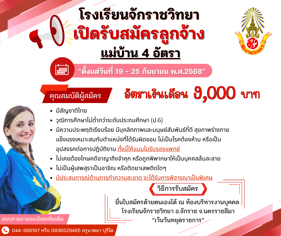 ประกาศโรงเรียนจักราชวิทยา เรื่อง รับสมัครบุคคลเพื่อเลือกสรรเป็นลูกจ้างปฏิบัติงานให้ราชการ (จ้างเหมาบริการ) ตำแหน่ง แม่บ้าน โรงเรียนจักราชวิทยา