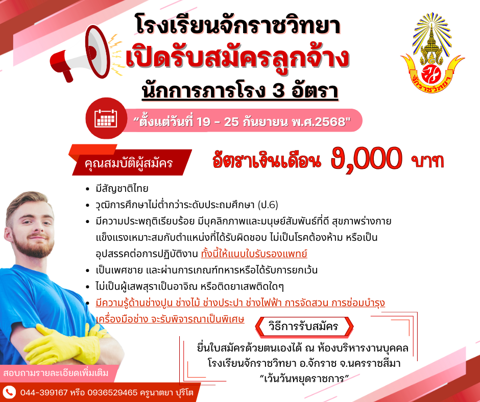 ประกาศโรงเรียนจักราชวิทยา เรื่อง รับสมัครบุคคลเพื่อเลือกสรรเป็นลูกจ้างปฏิบัติงานให้ราชการ (จ้างเหมาบริการ) ตำแหน่ง นักการภารโรง โรงเรียนจักราชวิทยา