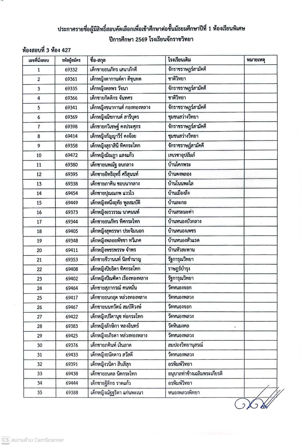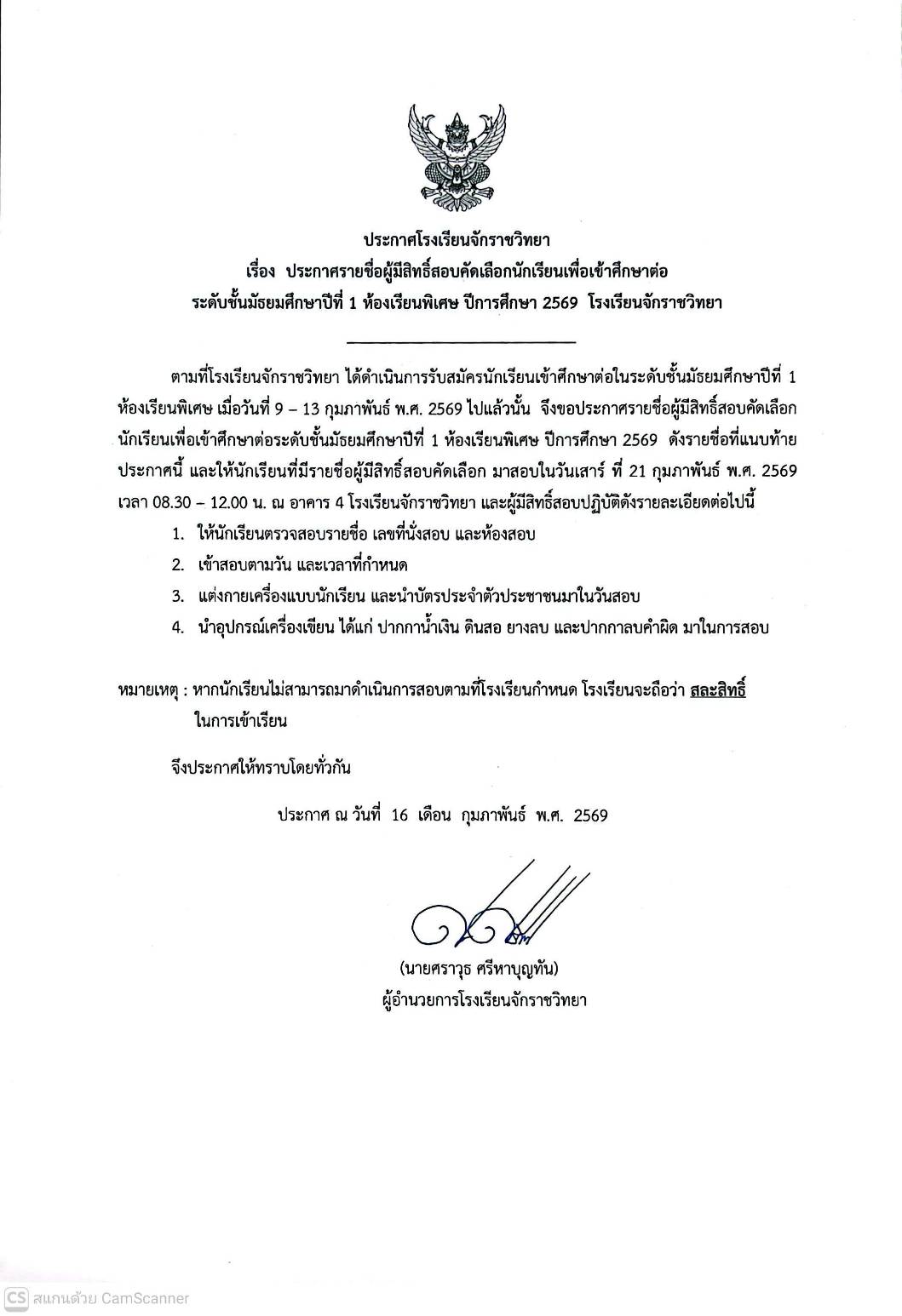 [ประกาศ] รายชื่อผู้มีสิทธิ์สอบคัดเลือก ม.1 (ห้องเรียนพิเศษ) ปีการศึกษา 2569 โรงเรียนจักรราชวิทยา