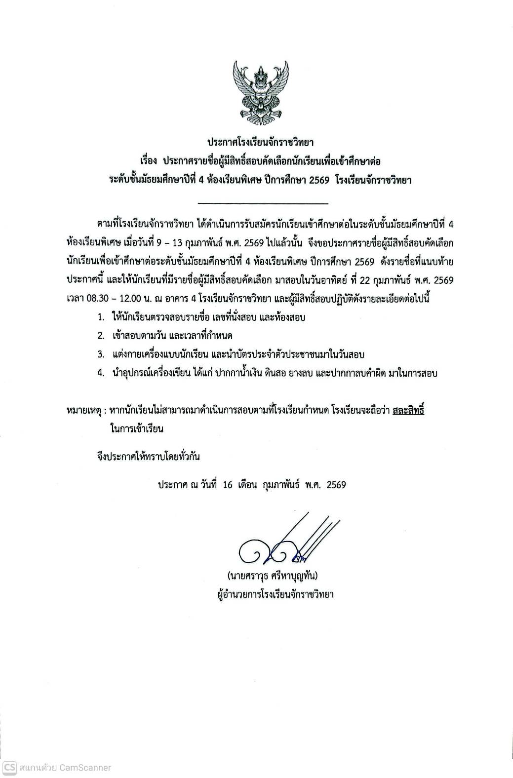 [แจ้งประกาศ] รายชื่อผู้มีสิทธิ์สอบ ม.4 (ห้องเรียนพิเศษ) ปีการศึกษา 2569 โรงเรียนจักรราชวิทยา